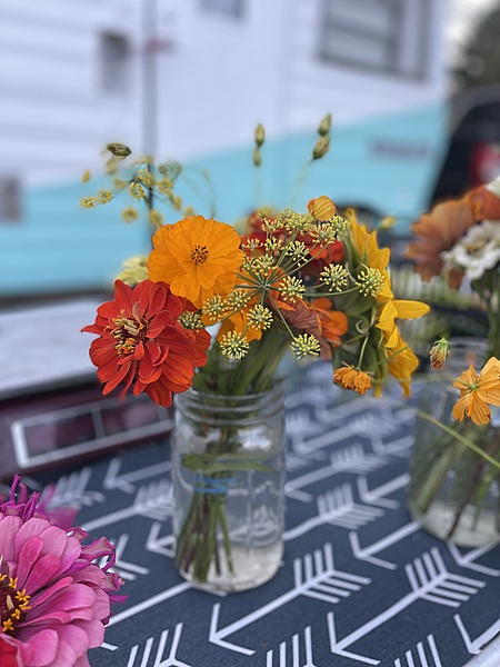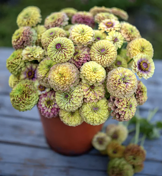 These zinnias are very special. They are bred by the owners of Wild Garden Seed - the mentors of Floret. They are bred from a mix of Oklahoma Ivory X Magic Bus and the resulting mix is combination of rose, magenta, apricot, coral, and cream. Doubled and semi-doubled heads up to 3” across on plants 30” tall. This is a project where the breeders are seeking to combine the mildew resistance and sturdy heads of the Oklahoma series with a new color palette from the super-diverse Magic Bus (tri-poms of red, orange and magenta)