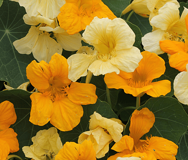 Warm butterscotch colors in the widely adored nasturtium are not only a treat for the eyes, but for the palate, too! Use the peppery flowers as a beautiful salad or dessert garnish. Short plants are ideal for containers or the front of the garden or border. Usually grown as an annual; perennial in USDA zones 10 and warmer. Fairly drought tolerant once established. Attracts pollinators. Rabbit and deer resistant.