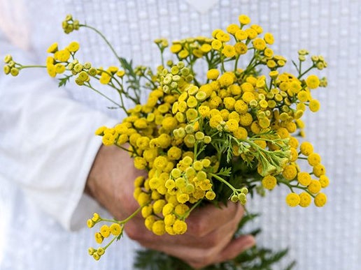 Tansy, also known as golden buttons, garden tansy, and bitter buttons—is a perennial herb in the daisy family (Asteraceae), related to asters, sunflowers, and chrysanthemums. It typically grows 1 to 5 feet tall and blooms from midsummer to early fall with clusters of fragrant, button-like yellow flowers. The upright stems are lined with fern-like, aromatic leaves that give tansy its distinctive look.