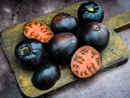 The darkest tomato we know! A dark, meaty, very rich-fleshed tomato with extreme anthocyanin expression (same antioxidant in blueberries and blackberries). So dark that some tomatoes turn solid blue-black on the skin. Deep red flesh is among the best tasting of all tomatoes. Rich, smooth and savory with earthy tones. Improves with room-temperature storage. - Baker Creek Rare Seeds